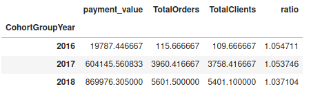 tt = cohorts.groupby('CohortGroupYear').agg({'payment_value': 'mean','TotalOrders':'mean','TotalClients':'mean'})